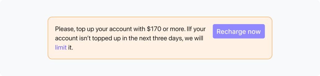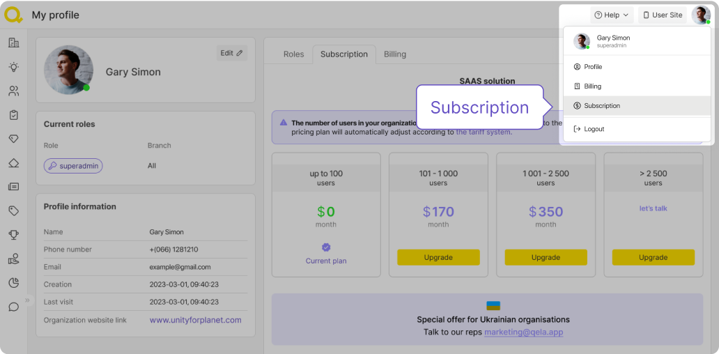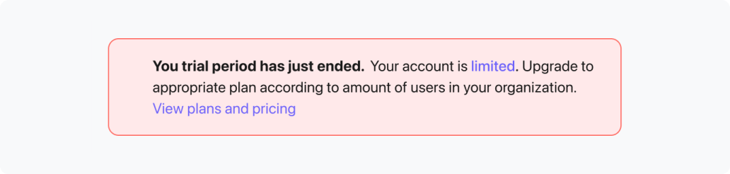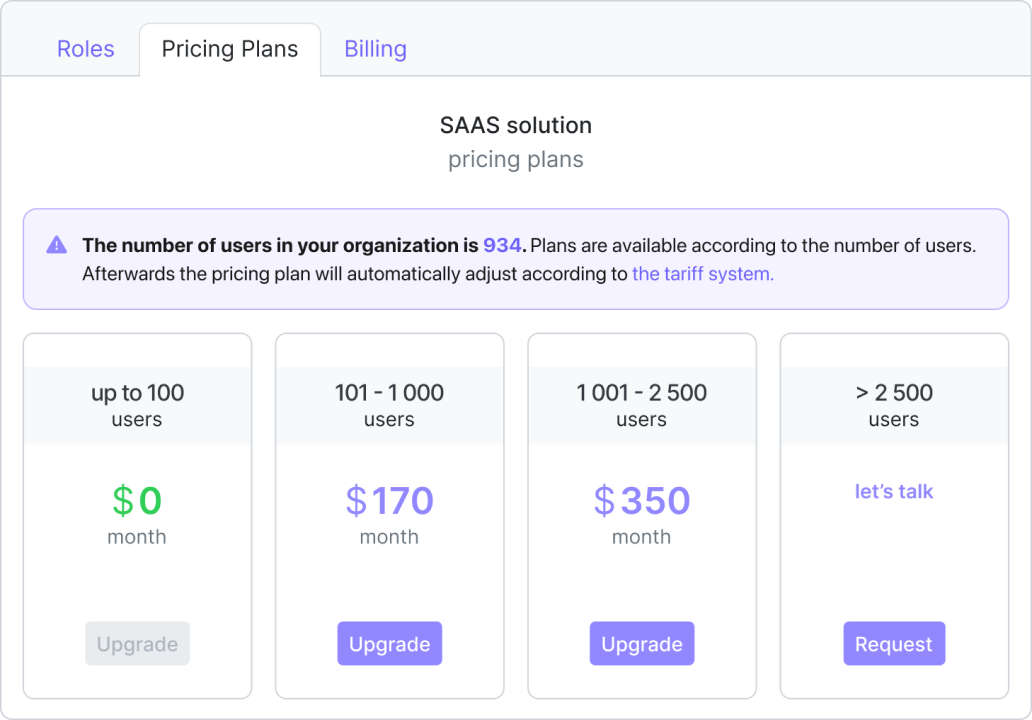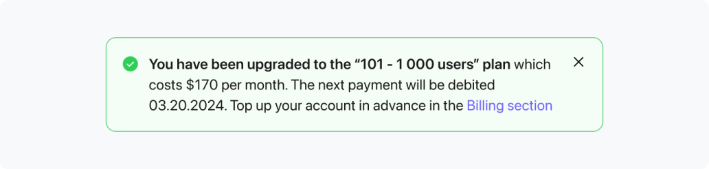 Pokud během používání počet uživatelů v organizaci klienta překročí zvolený tarif, obdrží oznámení o změně tarifního plánu s informacemi o datu příští platby a aktuálním stavu účtu.