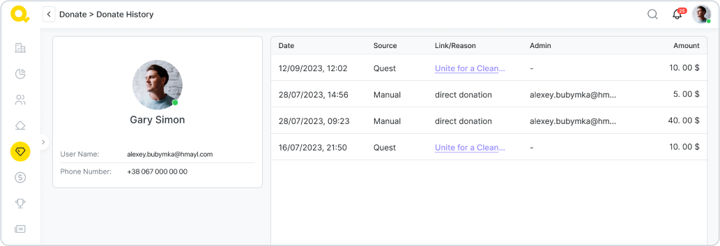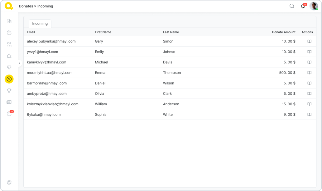 Na této stránce vidíte seznam všech darů, které vám byly zaslány prostřednictvím Qela. V levém horním rohu můžete vidět součet všech darů — celkovou částku.