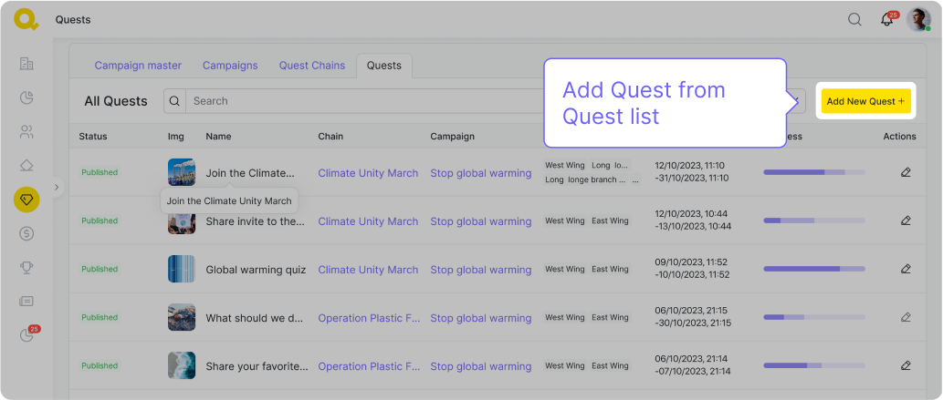 Úkoly vytvoříte kliknutím na tlačítko „Create New Quest“.