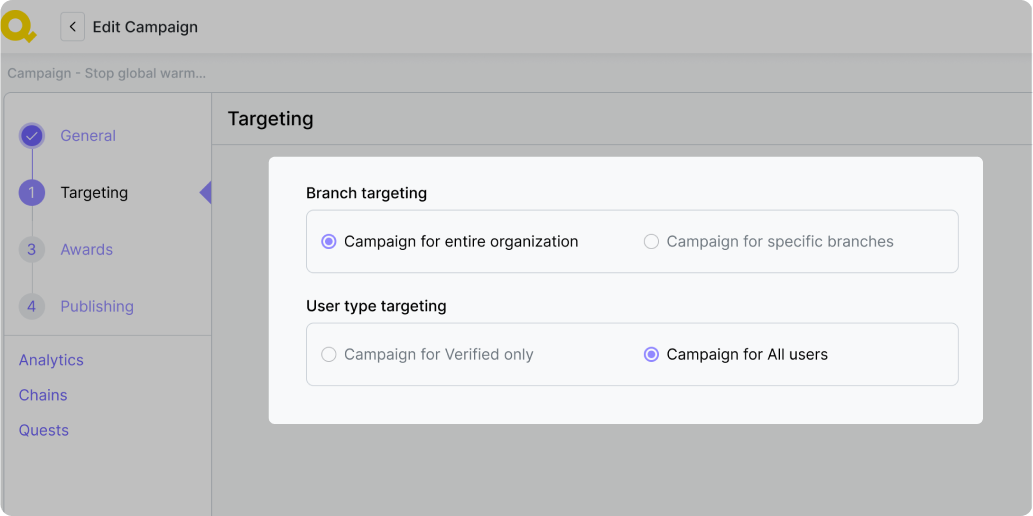 Kampaň můžete cílit na celou organizaci, konkrétní pobočky, všechny uživatele nebo jen na ověřené uživatele. Řetězce a úkoly v této kampani budou zaměřeny na stejnou skupinu uživatelů jako celá kampaň.