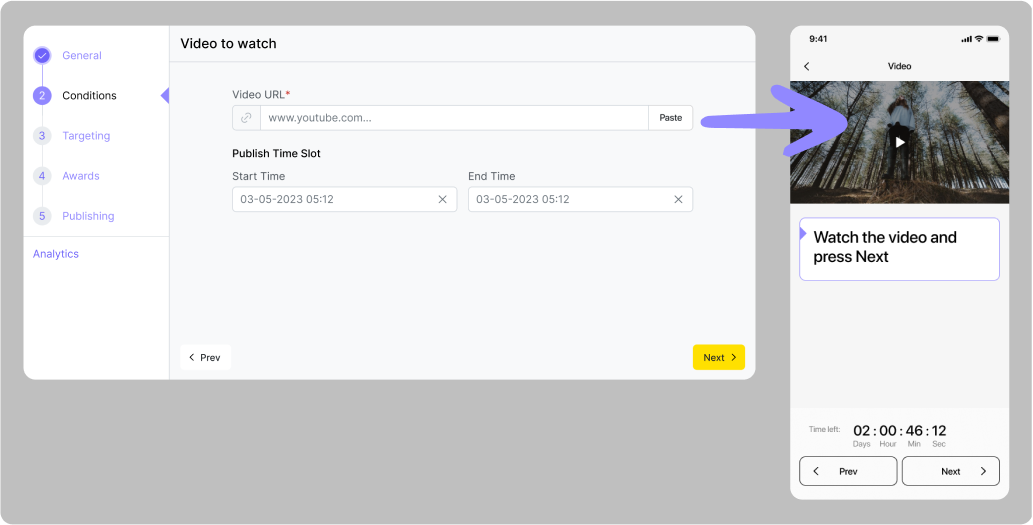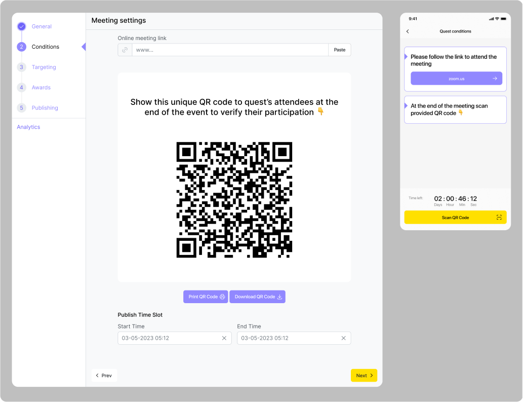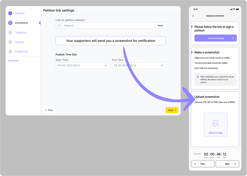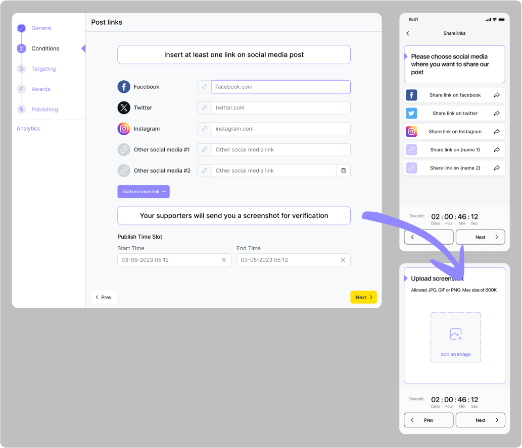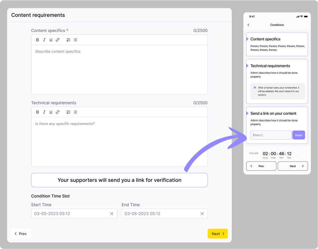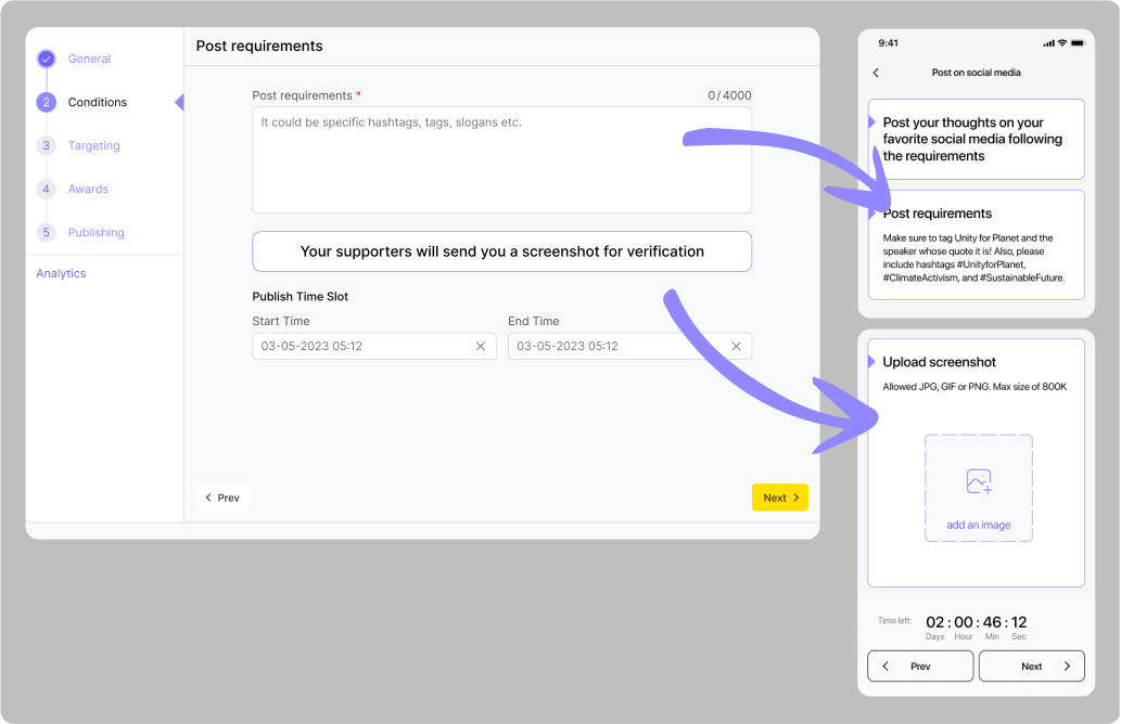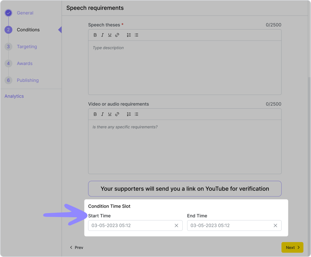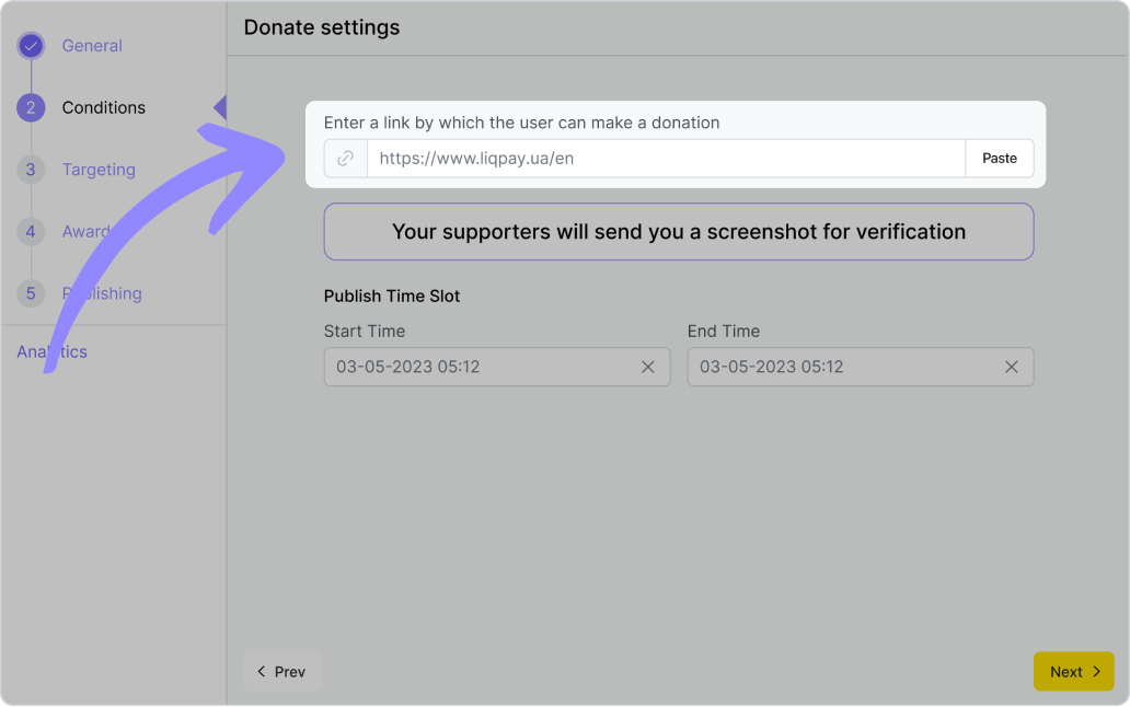 Na kartě „Conditions“ uveďte odkaz na platební systém a podmínku dokončení – uživatel musí do zadaného času nahrát snímek úspěšné transakce (nebo fotografii bankovního dokladu).