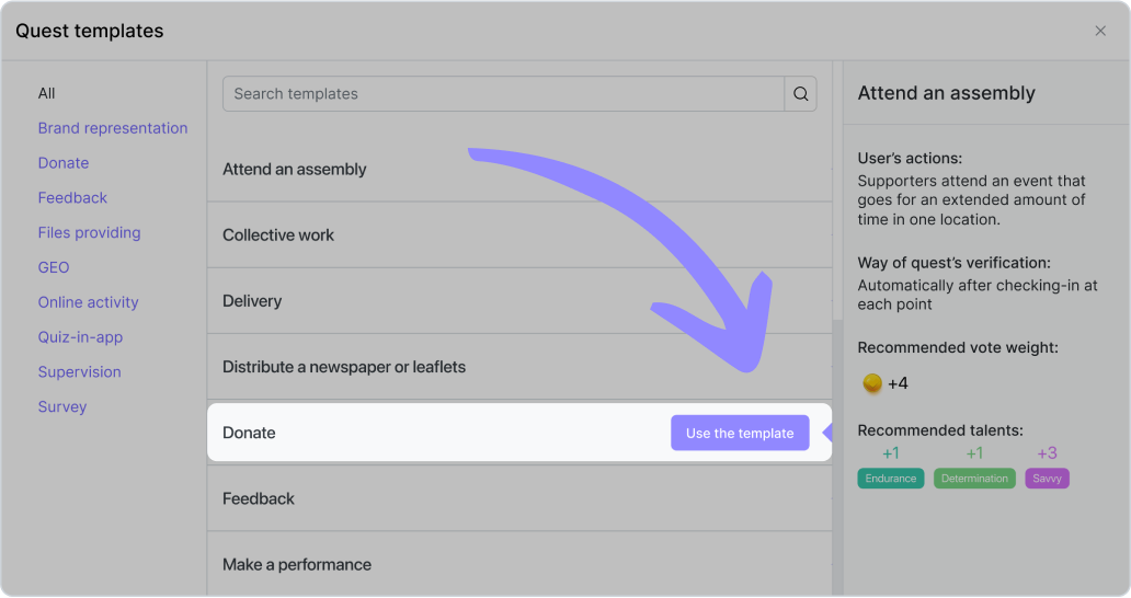 - V menu „Quest“ vyberte šablonu „Donate“.