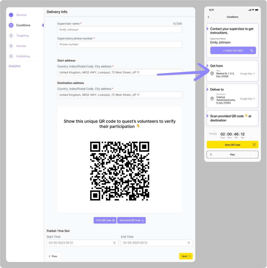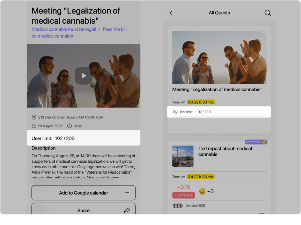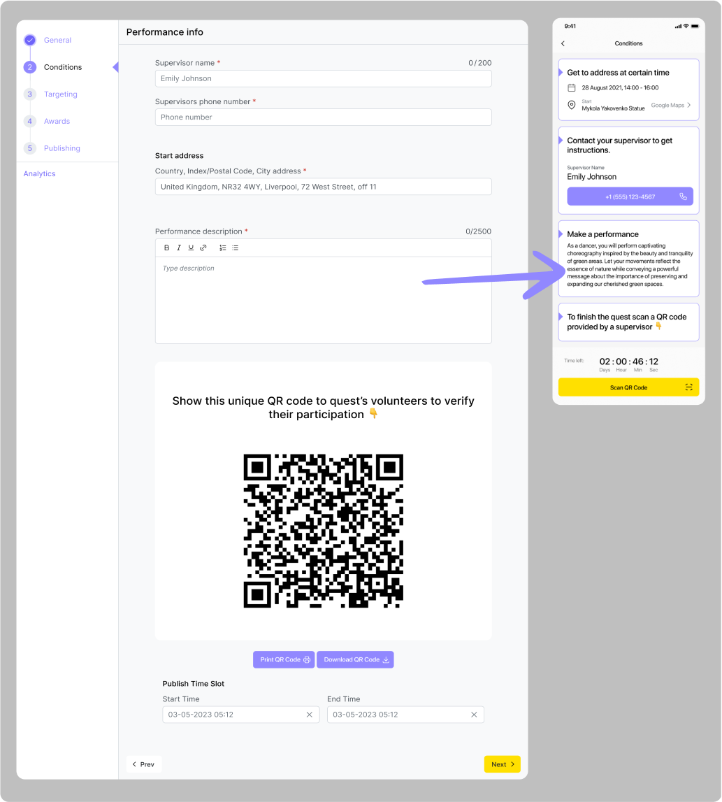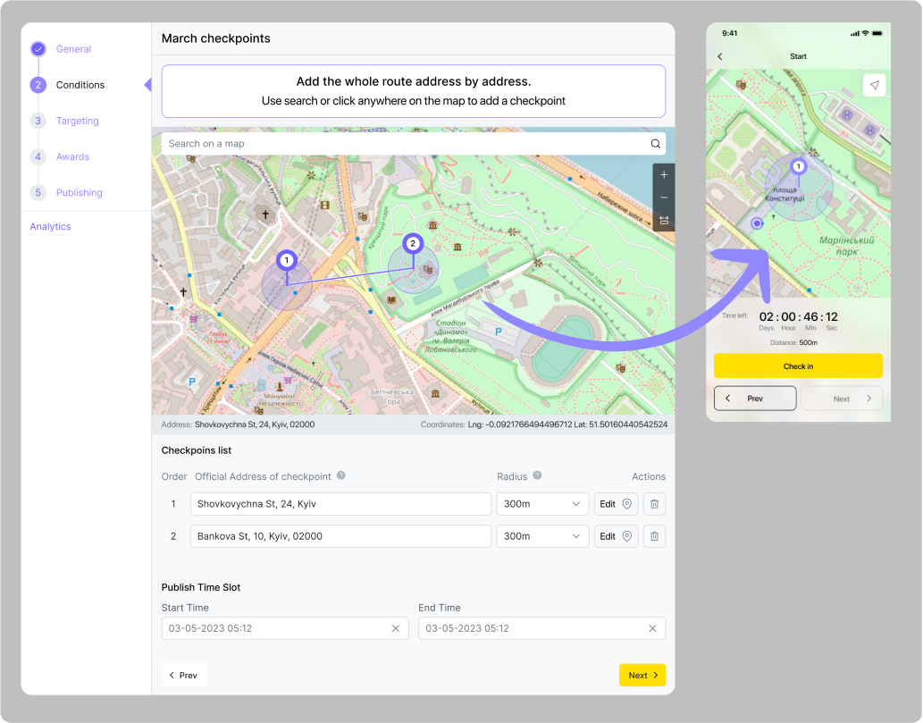 Příklad: Organizace se rozhodla uspořádat demonstraci, která potrvá dvě hodiny a začne v poledne dne 15.06.2024 na adrese Khreshchatyk 36. Správce organizace vytvoří geo-quest, ve kterém uvede adresu a vyplní všechna potřebná pole popisu, včetně „podmínky časového úseku”. Toto období by mělo začít kolem 11:30 dne 15. 6. 2024, aby příznivci mohli začít plnit úkol o něco dříve než začátek akce, a skončit dne 15. 6. 2024 ve 14:00. Aby měli uživatelé možnost se o akci dozvědět předem, měl by časový úsek „Publish time slot“ začít týden před akcí, kolem poledne dne 06.08.2024, a skončit dne 06.15.2024 ve 14:00. Uživatelé tak budou moci tento úkol vidět týden před demonstrací, ale začít ho plnit budou moci až půl hodiny před jejím začátkem.