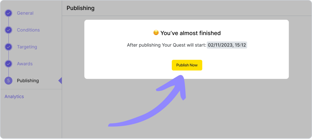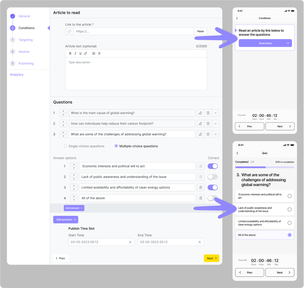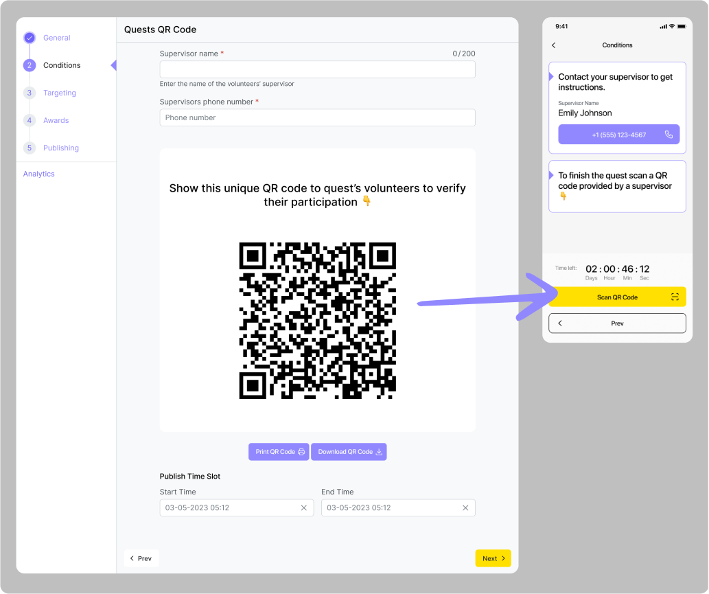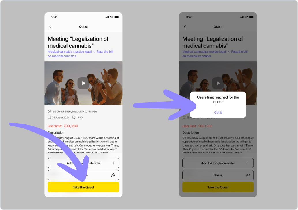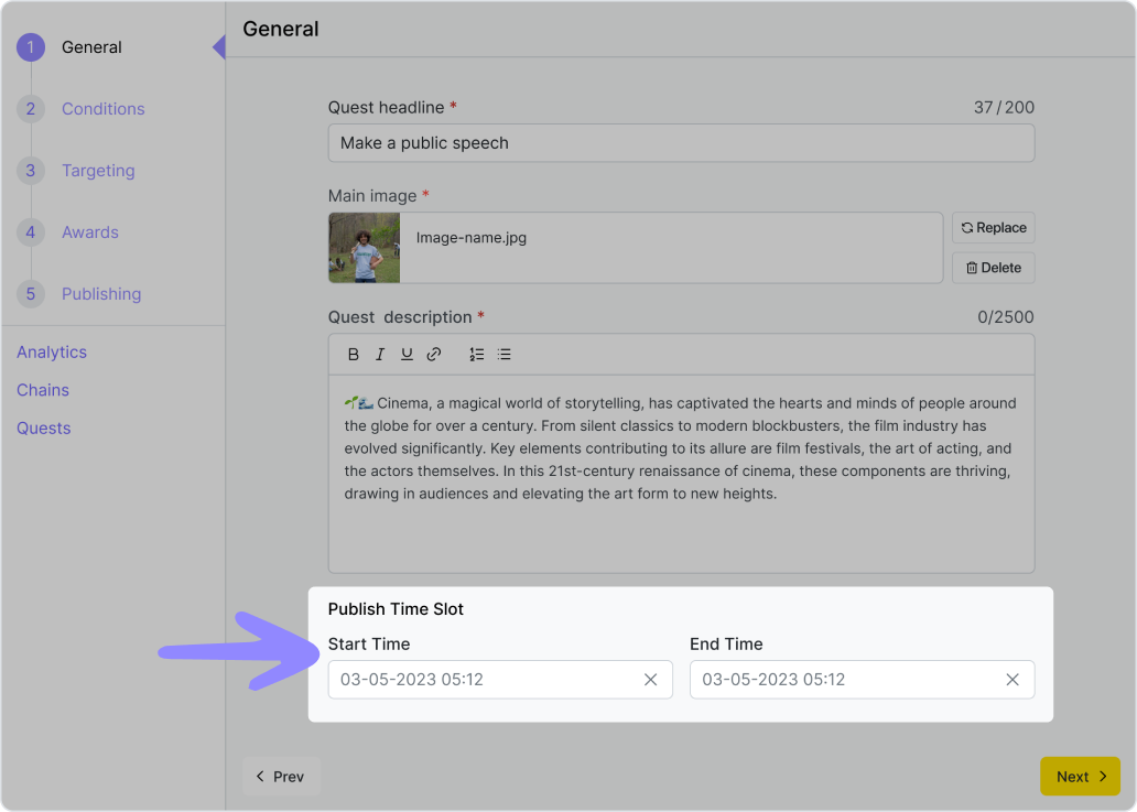 Příklad: Organizace se rozhodla uspořádat demonstraci, která potrvá dvě hodiny a začne v poledne dne 15.06.2024 na adrese Khreshchatyk 36. Správce organizace vytvoří geo-quest, ve kterém uvede adresu a vyplní všechna potřebná pole popisu, včetně „podmínky časového úseku”. Toto období by mělo začít kolem 11:30 dne 15. 6. 2024, aby příznivci mohli začít plnit úkol o něco dříve než začátek akce, a skončit dne 15. 6. 2024 ve 14:00. Aby měli uživatelé možnost se o akci dozvědět předem, měl by časový úsek „Publish time slot“ začít týden před akcí, kolem poledne dne 06.08.2024, a skončit dne 06.15.2024 ve 14:00. Uživatelé tak budou moci tento úkol vidět týden před demonstrací, ale začít ho plnit budou moci až půl hodiny před jejím začátkem.