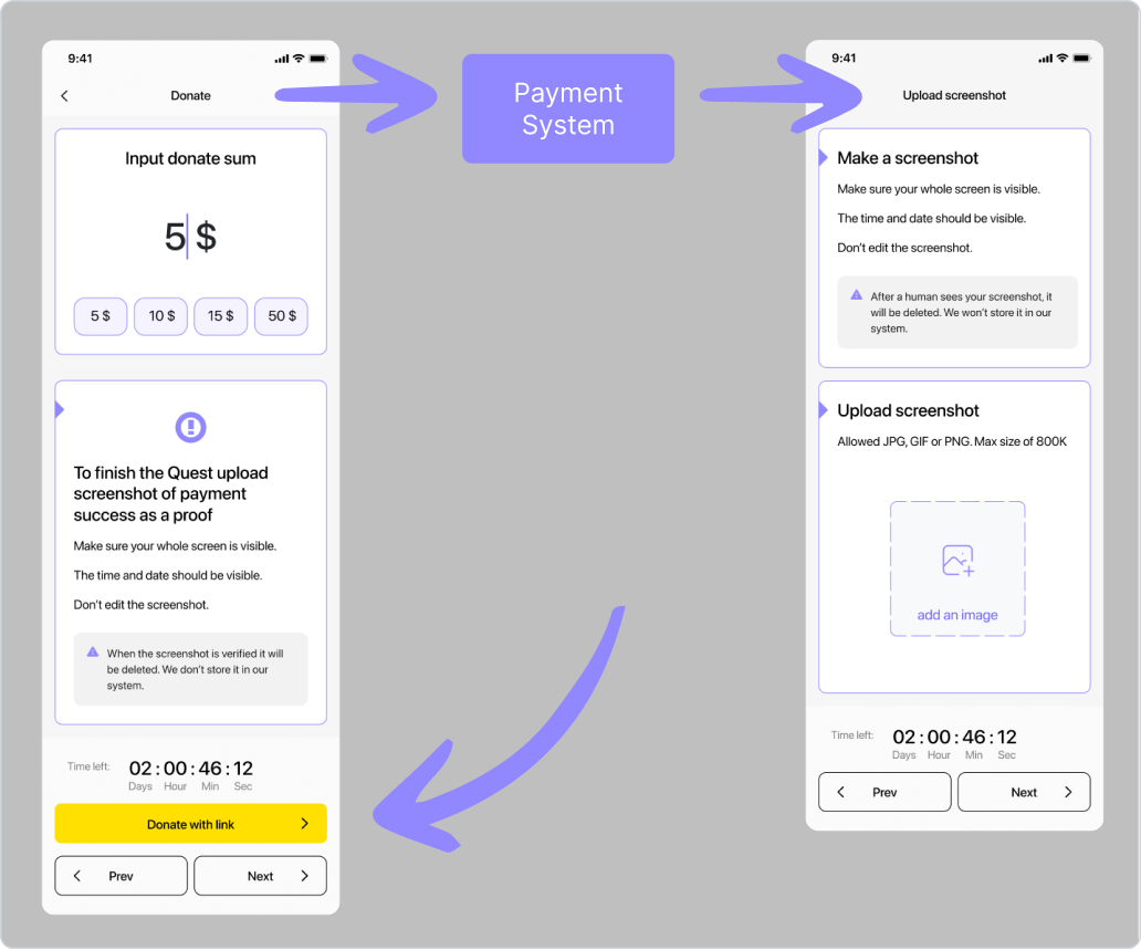 Uživatel klikne na „Take the quest“, vybere částku a podmínky, klikne na „Donate with link“ a provede platbu.