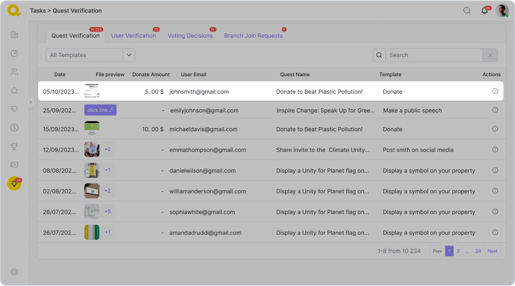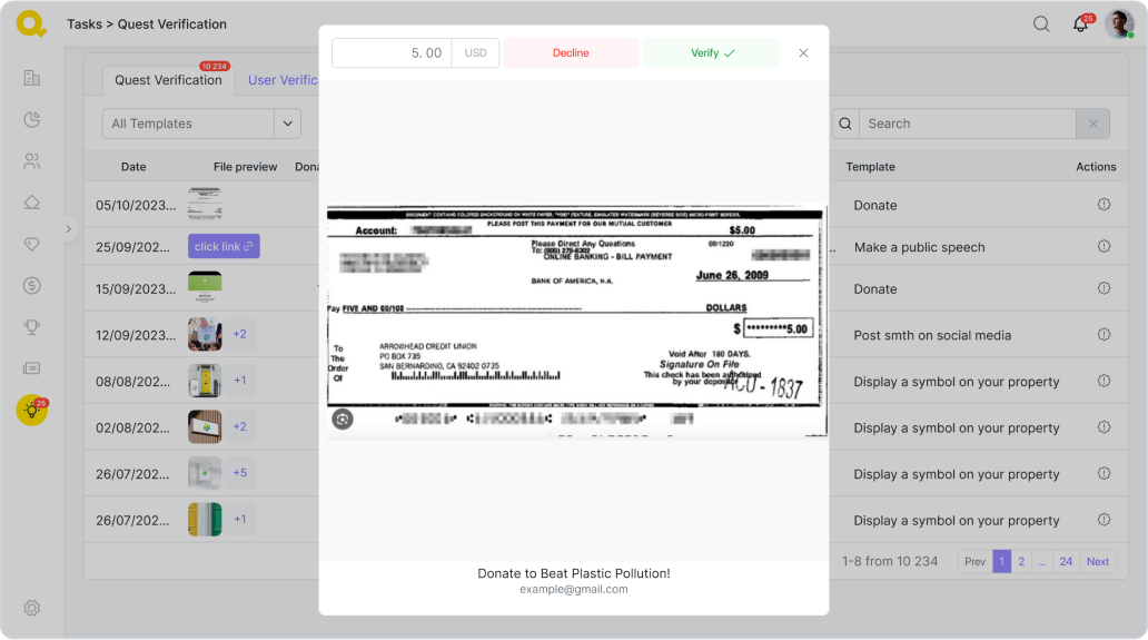 Administrátor poté uvidí nový úkol k ověření v sekci „Quest Verifications“.