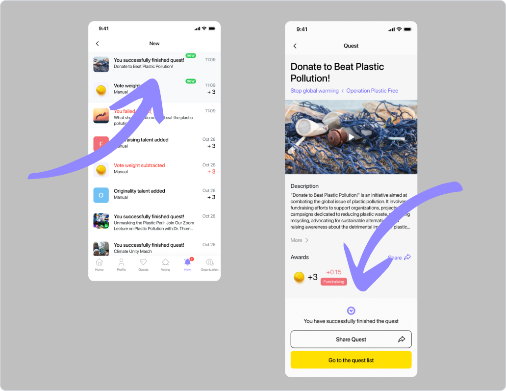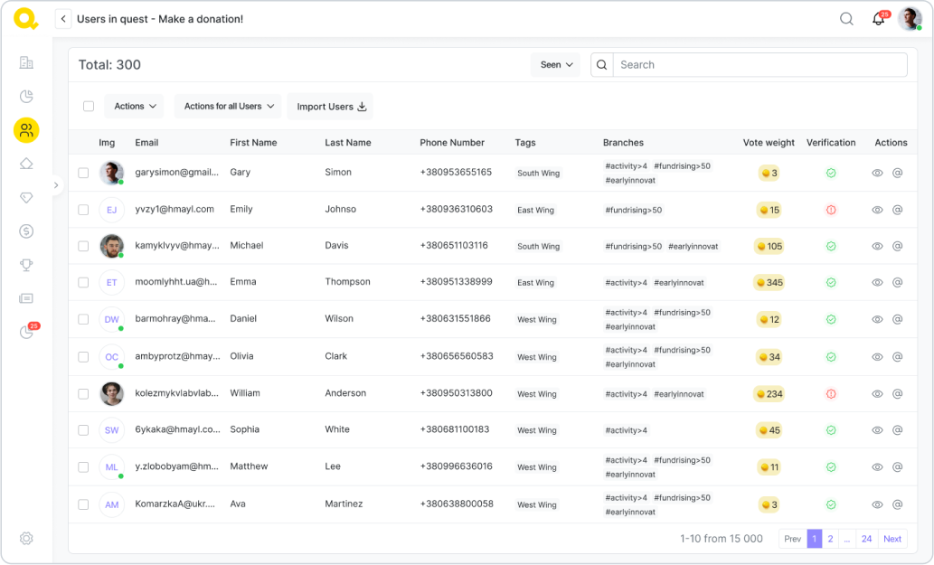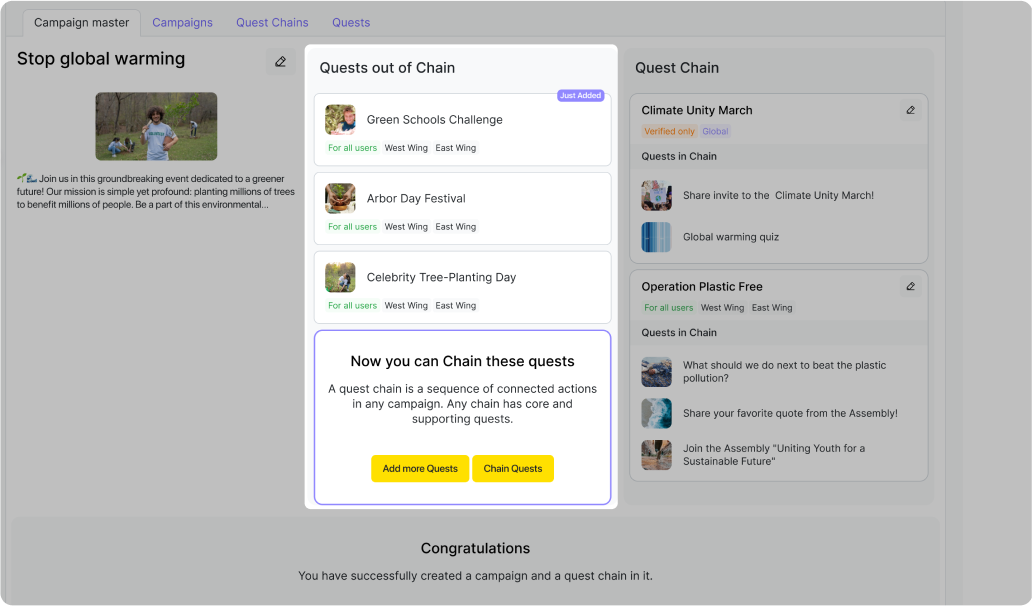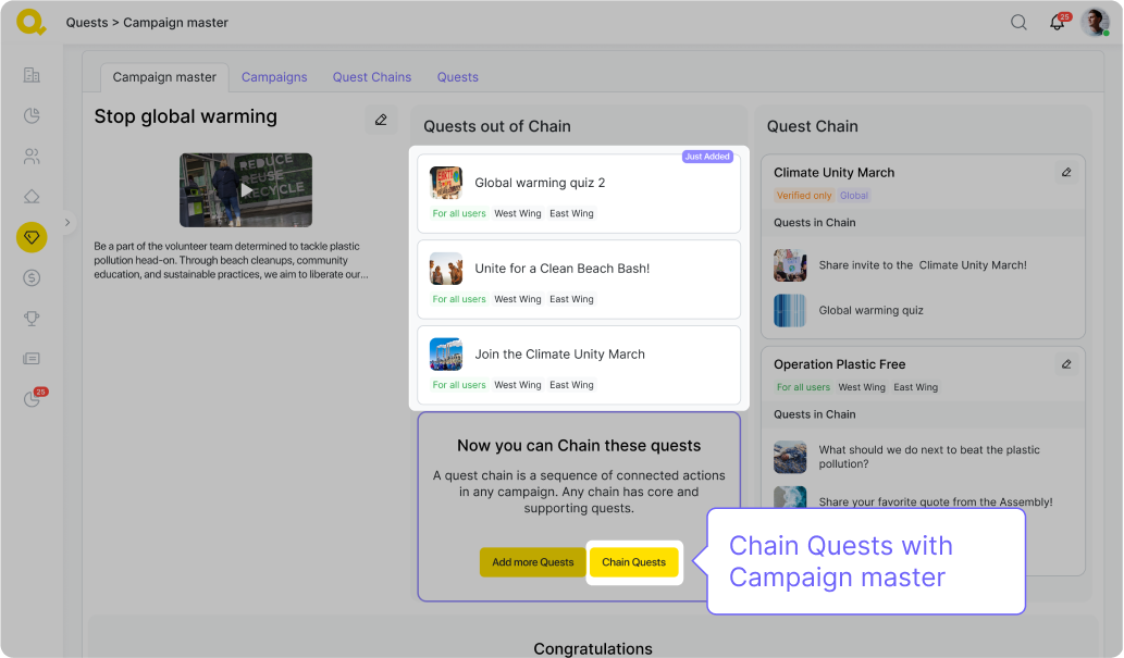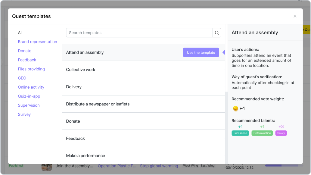 Hlavní funkcí Qela jsou úkoly (quests) a kampaně, které jsou spojeny s užitečnými činnostmi, které může dobrovolník vykonat pro organizaci – od podepsání petice po uspořádání komunitní akce. Máme 18 šablon různých aktivit, které si můžete upravit podle svých potřeb.