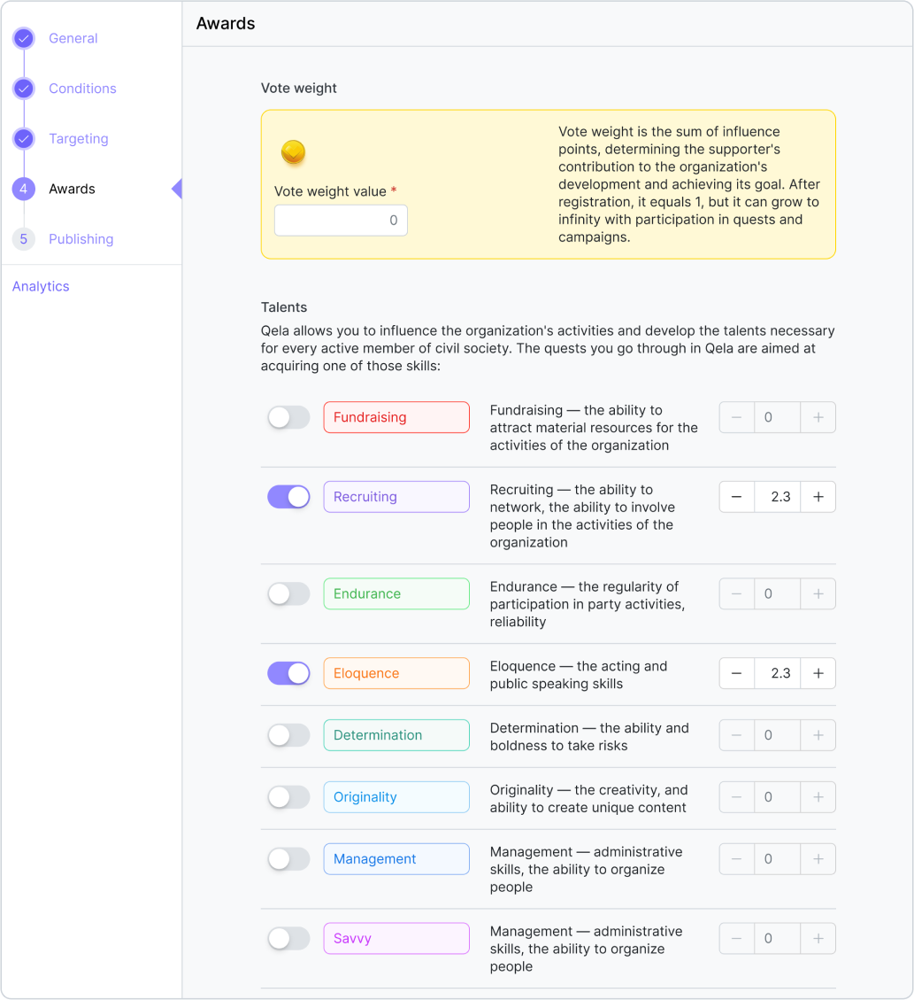 Dokončení úkolu musí přinést podporovateli určité množství bodů hlasovací váhy a rozvíjet některé z jeho talentů FREEDOMS. Máme návrhy, kolik bodů může každý úkol přinést, ale toto číslo můžete libovolně změnit v sekci „Odměny“ při vytváření úkolu. Maximální počet bodů, které může osoba za každý talent získat, je 1000. Zahrnuli jsme však speciální omezení, aby se zabránilo hromadění velkého počtu bodů v rukou několika málo lidí a také aby se stimulovali aktivní podporovatelé k další účasti. Poté, co dobrovolník získá 250 bodů za talent, získá pouze 75 % bodů za talent uvedených v úkolu, který přijme. Poté, co získá 500 bodů, získá pouze 50 % bodů uvedených v úkolu a pouze 25 % poté, co získá 750 bodů za talent.