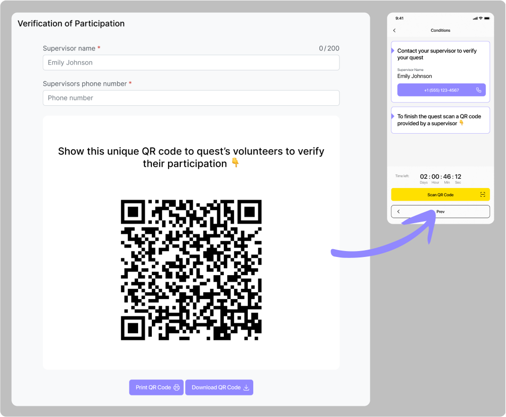 Kolektivní práce, doručení a kreativní aktivity – ověření probíhá naskenováním QR kódu od supervizora vaší organizace. Je nutné poskytnout kontakty na supervizora. U úkolu „Doručení“ je také třeba uvést adresy odeslání a doručení. U úkolu „Vystoupení“ je třeba popsat, jaký druh performance očekáváte.