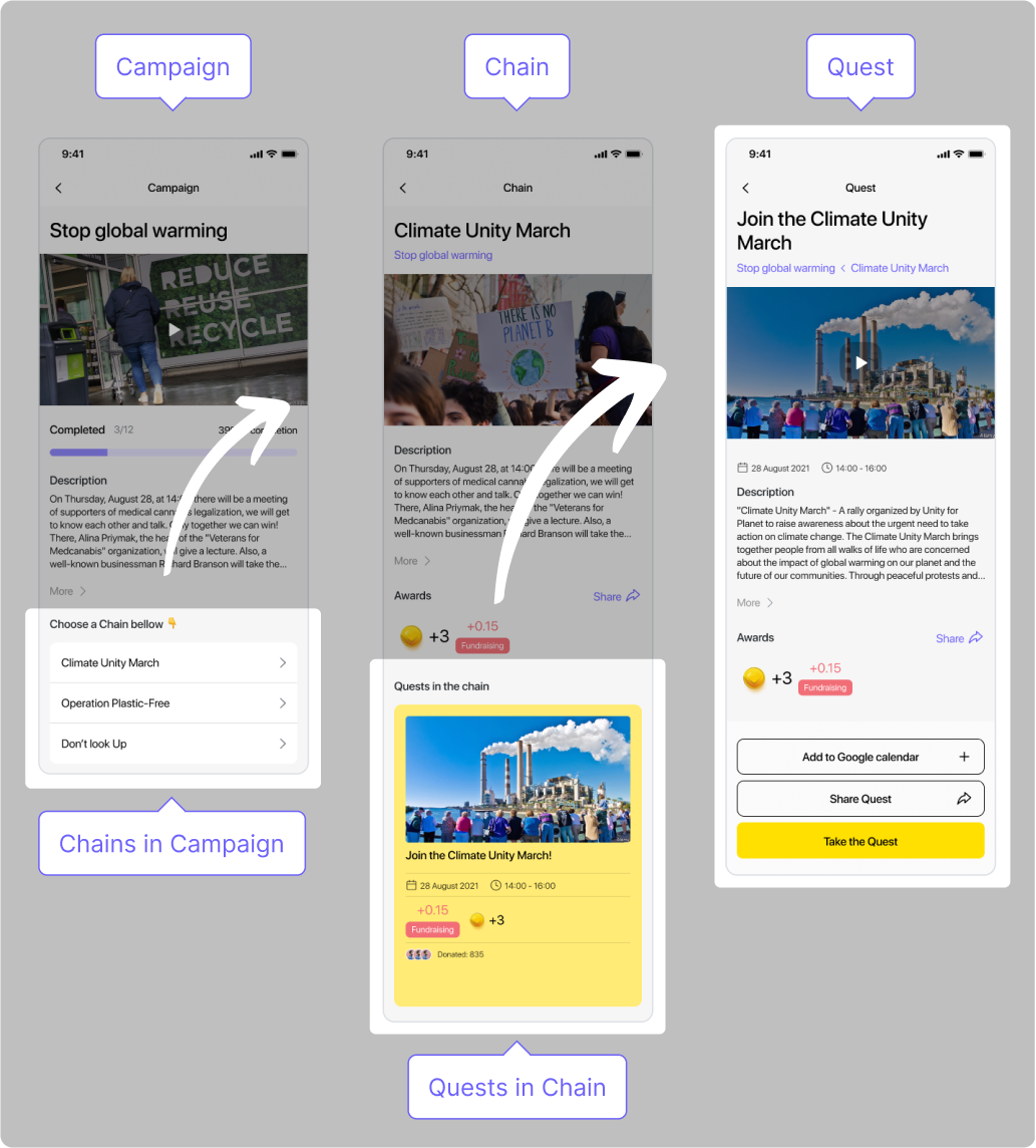 Funguje to takto: hlavní cíle, kterých chce organizace dosáhnout, se stanou základem kampaní. Ty se poté rozdělí na menší milníky – řetězce – a naplní se úkoly, tedy snadno dosažitelnými akcemi, které mohou podporovatelé vykonat, aby pomohli vaší organizaci dosáhnout jejích cílů.