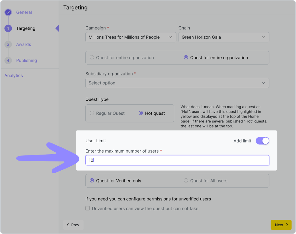 U některých úkolů může být nutné omezit počet účastníků (např. doručování). V záložce „Targeting“ zapněte posuvník a zadejte počet uživatelů.