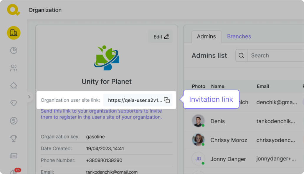 Pokud nemáte databázi dobrovolníků, můžete jednoduše zkopírovat původní odkaz Qela v nabídce „Organizace“ a zveřejnit jej na svých sociálních sítích nebo zaslat vlastní e-maily svým podporovatelům.