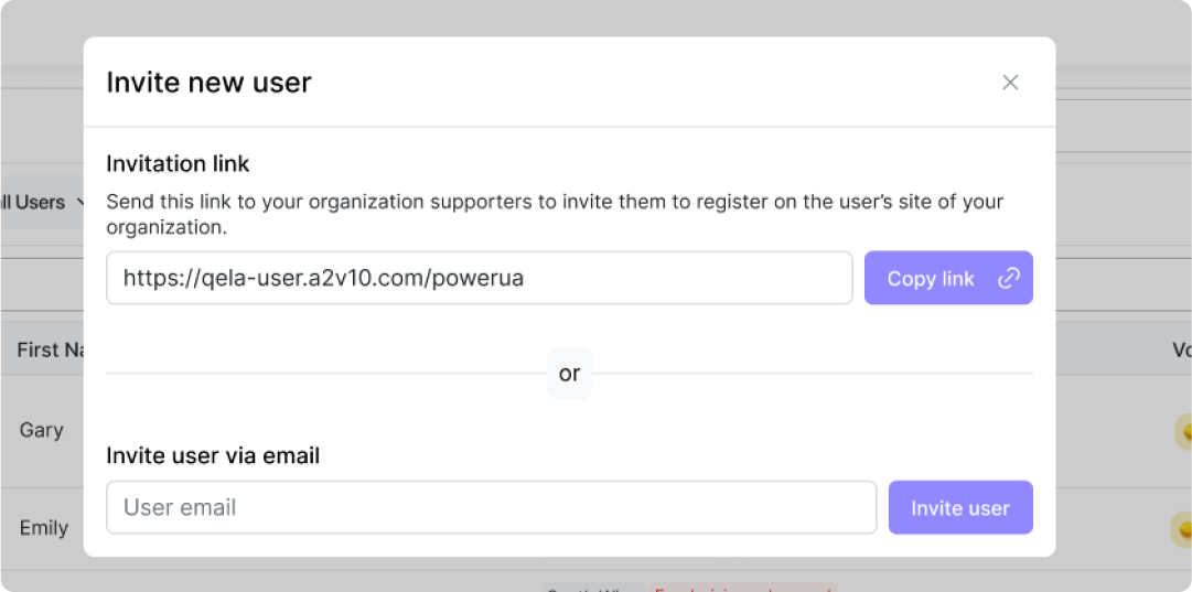 Po kliknutí na toto tlačítko může administrátor zkopírovat odkaz na organizaci, který zašle uživateli, nebo zadat e-mailovou adresu uživatele, kterého chce pozvat.