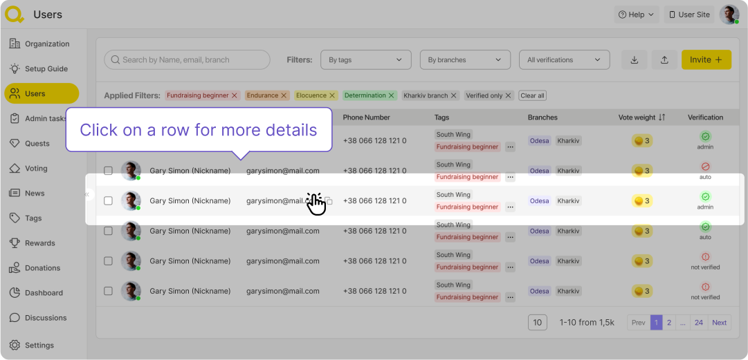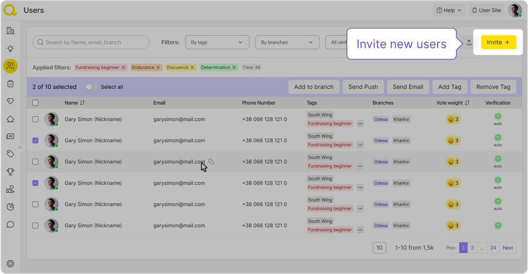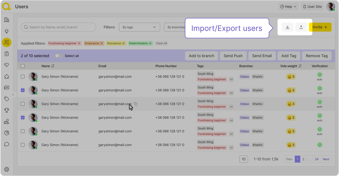 Můžete vybrat uživatele zaškrtnutím políček vedle jejich údajů. Poté je můžete přidat do pobočky, poslat jim push notifikaci nebo e-mail, nebo je označit štítkem.