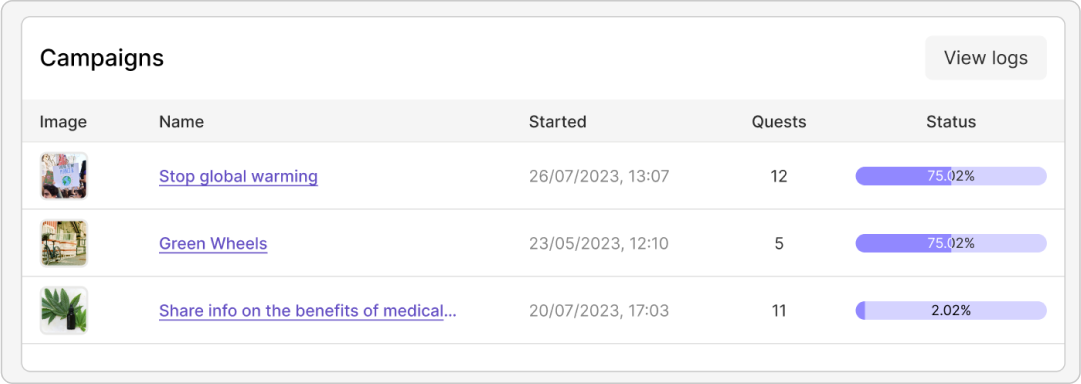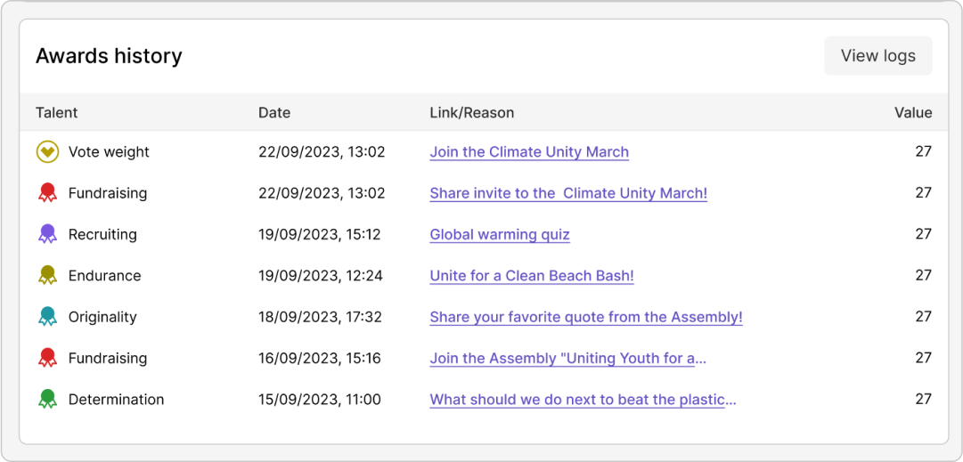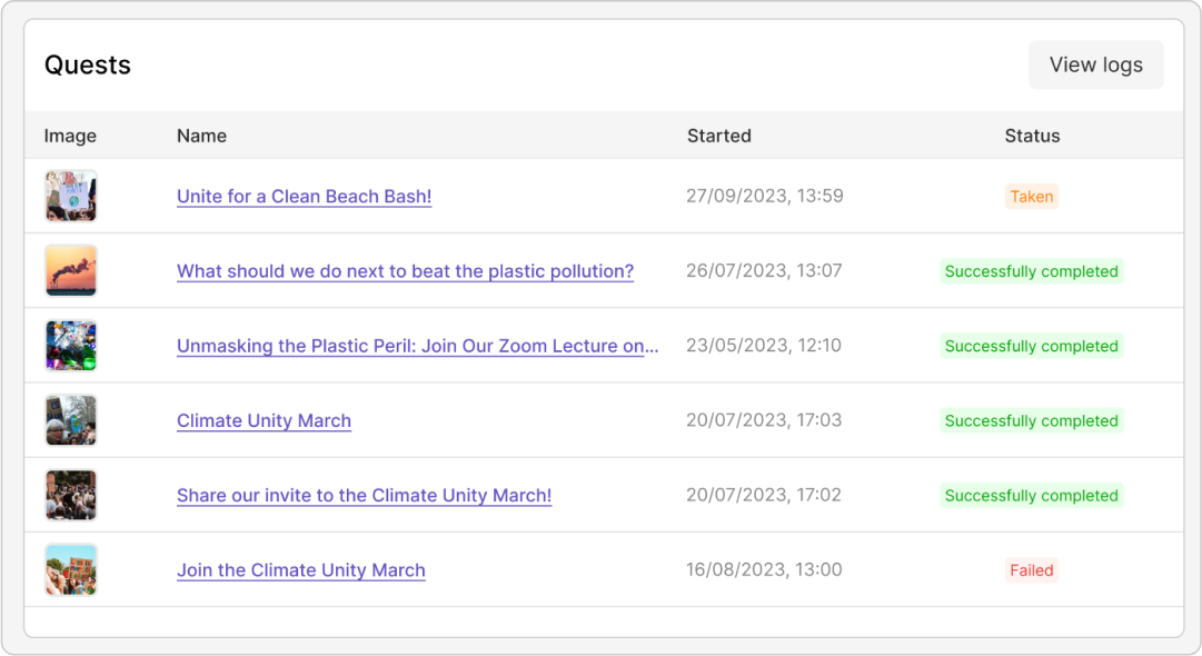 "Pomocí jednotlivých grafů se můžete dozvědět více o tom, jak podporovatel interaguje s vaší organizací prostřednictvím Qela. Můžete vidět jeho zapojení do questů a kampaní i jeho odměny po kliknutí na „Zobrazit záznamy“ u jednotlivých grafů "