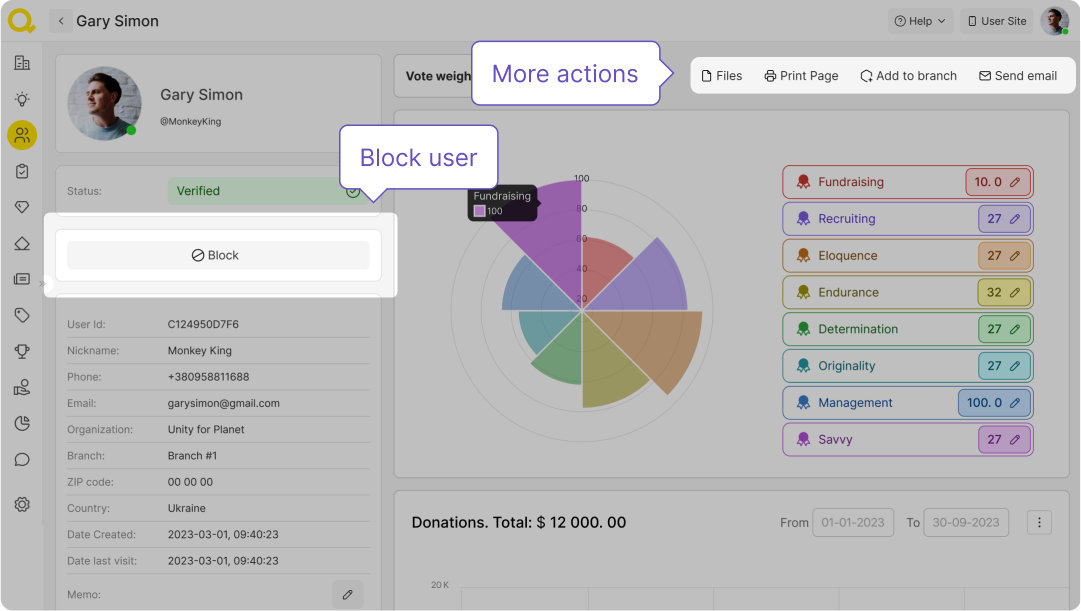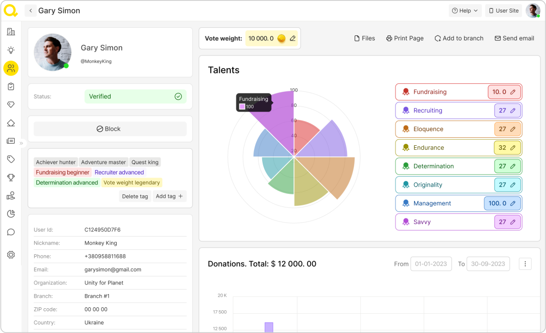 Profil uživatele obsahuje podrobné informace o aktivitě dobrovolníka ve vaší organizaci v Qela.