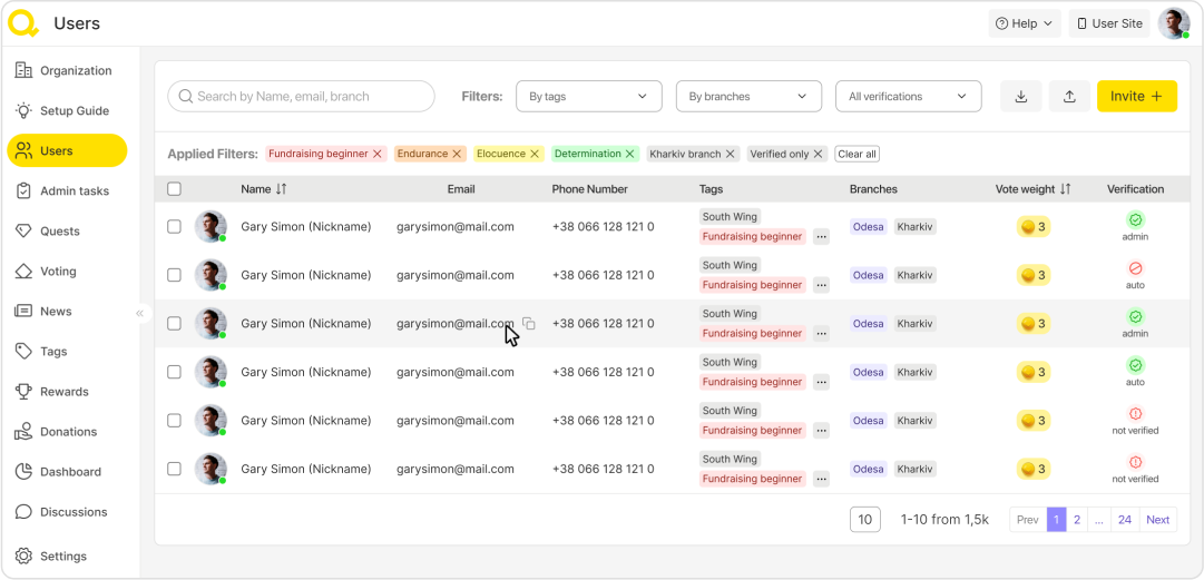 Tato stránka uchovává informace o všech vašich podporovatelích, jejich údajích a zapojení do vaší organizace. Informace jsou zobrazeny v seznamu po 10 podporovatelích na stránku. Obsahuje jejich e-mail, jméno, telefonní číslo, pobočku, stav ověření, váhu hlasu (Vote Weight) a vlastní štítky.