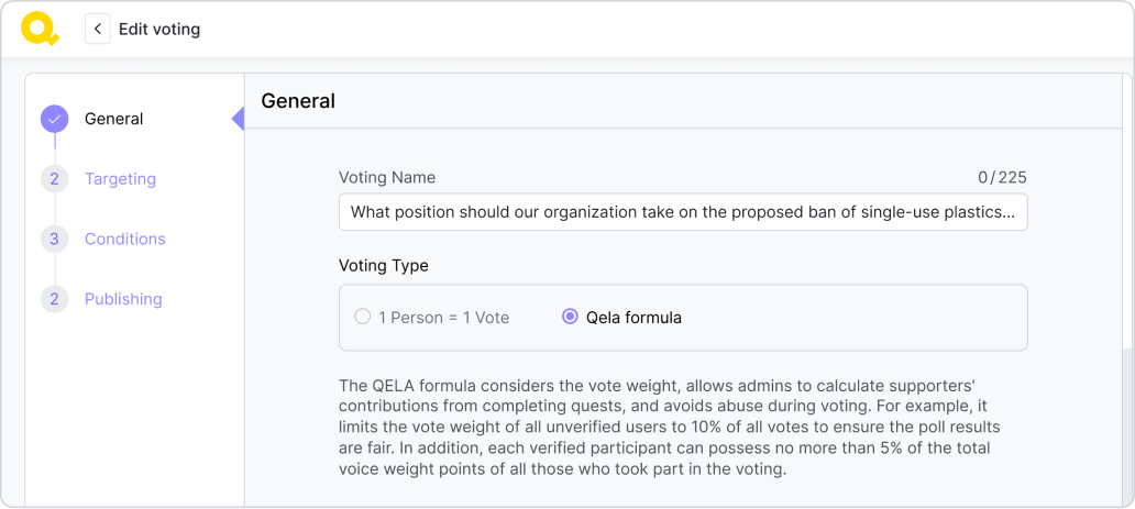 Další volbou při vytváření hlasování je, zda použít hlasovací vzorec Qela. Tento vzorec zohledňuje váhu hlasu – součet bodů vlivu určujících podíl podporovatele na rozvoji organizace. Váha hlasu podporovatele závisí na počtu splněných questů a kampaní. Čím více je podporovatel zapojen, tím větší vliv má na výsledek hlasování.