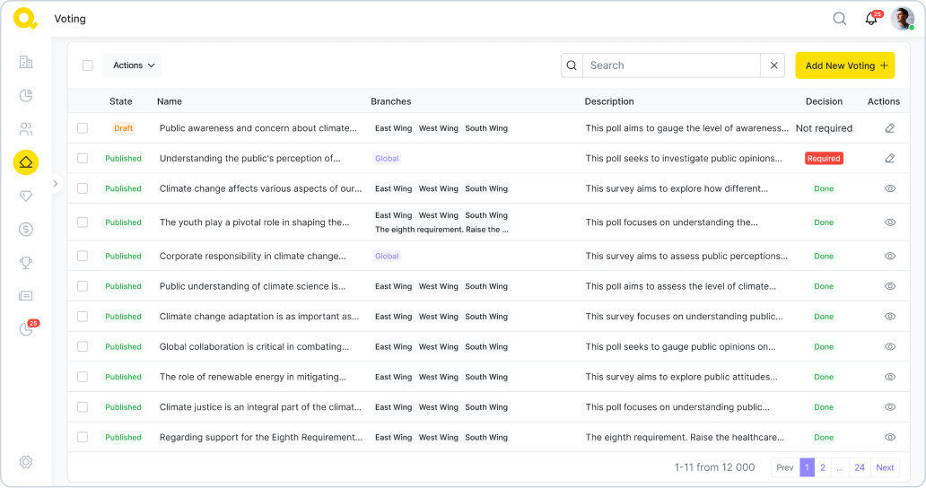 Tato stránka uchovává všechna hlasování, kterých se chcete, aby se vaši podporovatelé zúčastnili. Hlasování je jednou z nejdůležitějších funkcí Qela, protože je skvělým způsobem, jak motivovat podporovatele k účasti na každodenním životě organizace a učí je uplatňovat svou hlasovací sílu.