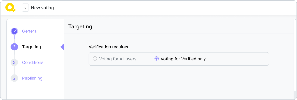 Můžete vytvořit hlasování pro všechny uživatele nebo pouze pro ověřené uživatele. Pokud zvolíte možnost pro všechny uživatele, existuje šance, že výsledky mohou být ovlivněny boty, nicméně tomu se snažíme zabránit omezením váhy hlasu neověřených uživatelů: jejich hlasy nemohou tvořit více než 10 % konečného výsledku. Pokud však dovolíte hlasovat pouze ověřeným uživatelům, zabráníte některým dobrovolníkům, kteří neprošli ověřovacím procesem, ve hlasování, a tím pádem nezískáte úplný přehled o názorech všech podporovatelů.